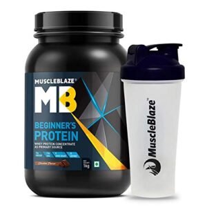 MuscleBlaze Beginner’s Whey Protein, No Added Sugar, Faster Muscle Recovery & Improved Strength (Chocolate, 1 kg / 2.2 lb, 33 Servings) with Shaker, 650 ml (Combo Pack) Buy product