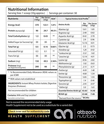 ✅GIVES MUSCLE POWER AND STRENGTH- Each serving of 33g of Abbzorb Raw+ Whey Isolate 90% delivers over 7.48 grams of naturally occurring Branched Chain Amino Acids (BCAAs). Each serving provides 4.01 grams of Glutamic Acid- best for intense workout, effective in muscle gain and protein synthesis.