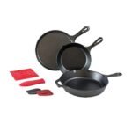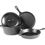 The new Lodge one-piece cast iron cookware set includes top selling Lodge cast iron cookware combined into one set. Includes 10. 25″ Cast iron skillet, 5 quart cast iron Dutch Oven, 10. 5″ Cast iron griddle and cast iron lid that fits both the Dutch oven and skillet. The 10. 25″ Lodge cast iron skillet is hailed as an essential kitchen tool by the country’s leading chefs and publications, and features an assist handle. The round 10. 5″ Lodge cast iron griddle is the perfect tool for cooking pancakes, pizza or quesadillas. The slightly raised edges keep oil, batter and other ingredients neatly contained. The Lodge 5 quart Dutch oven is an extremely versatile vessel, perfect for savory stews and roasts, as well as crispy breads and cobblers. Loop handles make it easy to move from stovetop to oven. The cast iron cover can be used on both the Dutch oven and the skillet. Lodge cast iron is seasoned with oil for a natural, easy-release finish that improves with use. Brutally tough for decades of cooking, cast iron is unparalleled in heat retention and even heating. The right tools to sear, sauté, simmer, bake, broil, braise, roast, fry or grill. At home in the oven, on the stove, on the grill or over the campfire. Great for induction cooktop. Easy care: Hand wash, dry, rub with cooking oil.